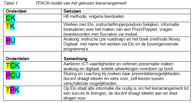 Kort gezegd houdt het TPACK-model in dat je goed let op de samenhang tussen vakinhoud, didactiek en techniek. In de Achtergrondinformatie staat uitgebreid omschreven hoe dit bij het leerarrangement tot stand is gekomen. Het komt er op neer dat zowel met digitaal materiaal als met de methode (het boek) wordt gewerkt, dat leerlingen een nieuwe manier van presenteren leren met behulp van technologie en dat leerlingen door zelfstandig- en samenwerkend leren te combineren worden geacht de stof zich zo goed mogelijk eigen maken. Verder worden leerlingen in de actieve modus gezet, waarbij de docent een meer coachende rol aan neemt. In eigen woorden komt het Conversational Framework erop neer dat hiermee de effectiviteit van de leeromgeving kan worden bepaald. Achteraf was het goed om voor deze twee kaders te kiezen, zodat onze leeromgeving een stevig anker had.